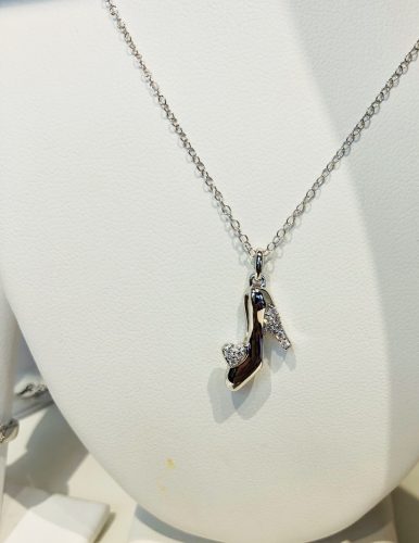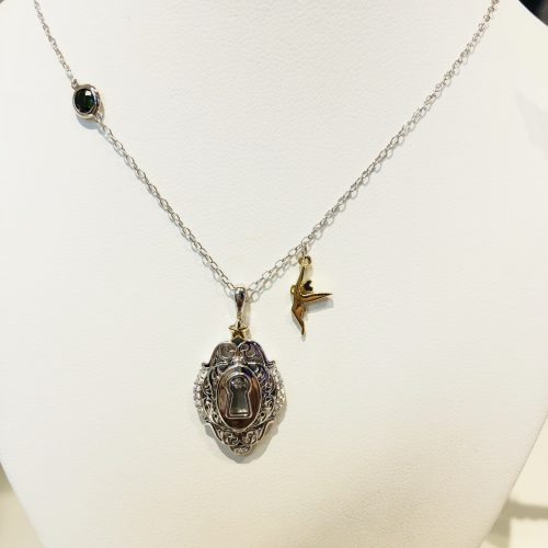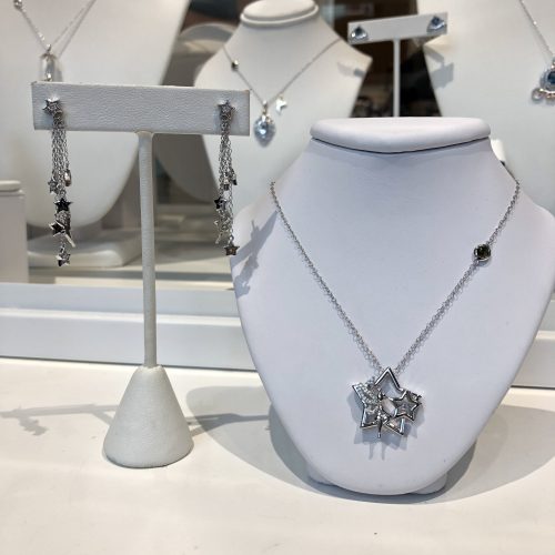 Three Tinkerbell pieces are included also. The first necklace is a keyhole with a tiny, dangling Tinkerbell. An off-set green gem is embedded in the chain. The keyhole necklace is $500. The second necklace features Tinkerbell perched on a star with her wand. The matching earrings are tons of tiny stars in a mixture of solid silver, clear, and green gems among a flying Tinkerbell. The earrings are dangling but also quite delicate. The necklace is $400 and the earrings are $500.
