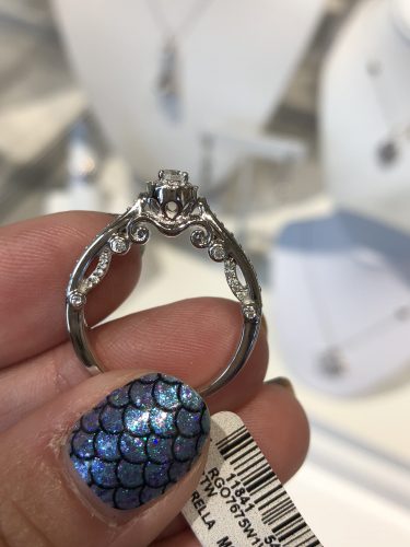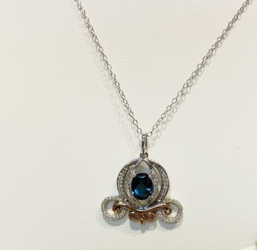 Cinderella is always featured in these collections, and these pieces certainly do not disappoint! The carriage necklace is a mix of silver, white gold, and rose gold. It’s stunning! It retails for $1000. A matching ring and earrings are also available. The ring has a gorgeous setting visible from the side. The ring is $500 and the earrings are $400.
