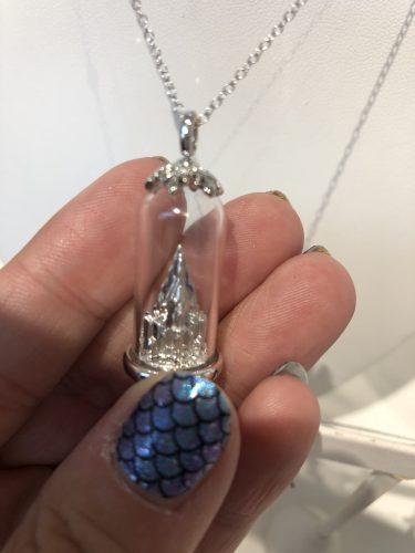 This Elsa snowflake ring is probably the sparkliest piece in the whole collection. At $5000, it’s definitely the most expensive! It’s 14 karat white gold and has one full carat of diamonds. It is stunning! Elsa’s ice palace is captured under a glass dome in the other Frozen piece. The bale is a snowflake and a really beautiful detail. It’s a very delicate looking piece.