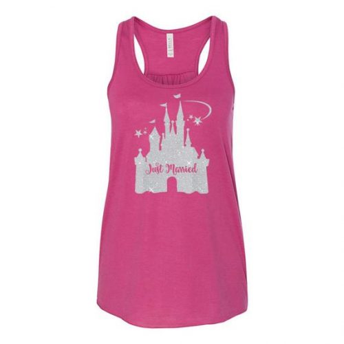The design features a full glitter image of Cinderella Castle. Near the top of the castle, you will find a trail of Tinker Bell’s pixie dust for that extra little bit of magic and sparkle. Through the center of the castle are the words “Just Married” in a fun font. I think this design is pretty much picture perfect in pink, but you can choose from a whole range of tank top and glitter colors to best suit your personality and style.
