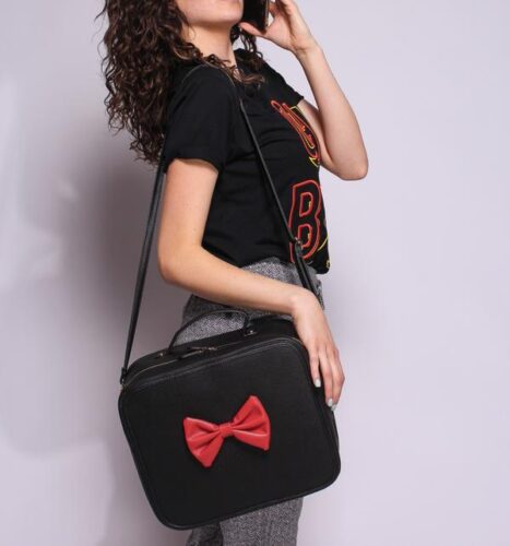 I also love how great this bag looks! It’s seriously a fashion accessory on its own. The black vegan leather and red bow is TOTALLY my style!