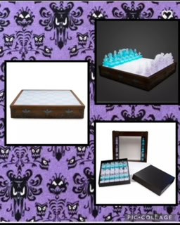 You’ll find your favorite Haunted Mansion Haunts gracing the chess pieces. Characters include: Hitchhiking Ghosts, Madame Leota, Hatbox Ghost, Decapitated Knight, Caretaker, raven and bat pawns. Who is your favorite character?