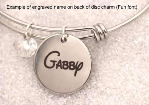 This adjustable and lightweight bangle is made with a stainless steel engraved disc. The disc can even be personalized with a name or date to add to the magic! Gabby is the name of my niece, so I am feeling a special connection with this bracelet already!