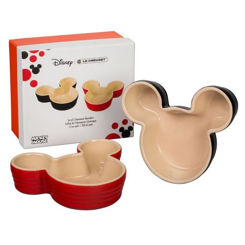 The ramekin set comes as a set of three Mickey shaped stoneware dishes. You can use them in the oven, or microwave, and they make stylish dishes for condiments and sides.