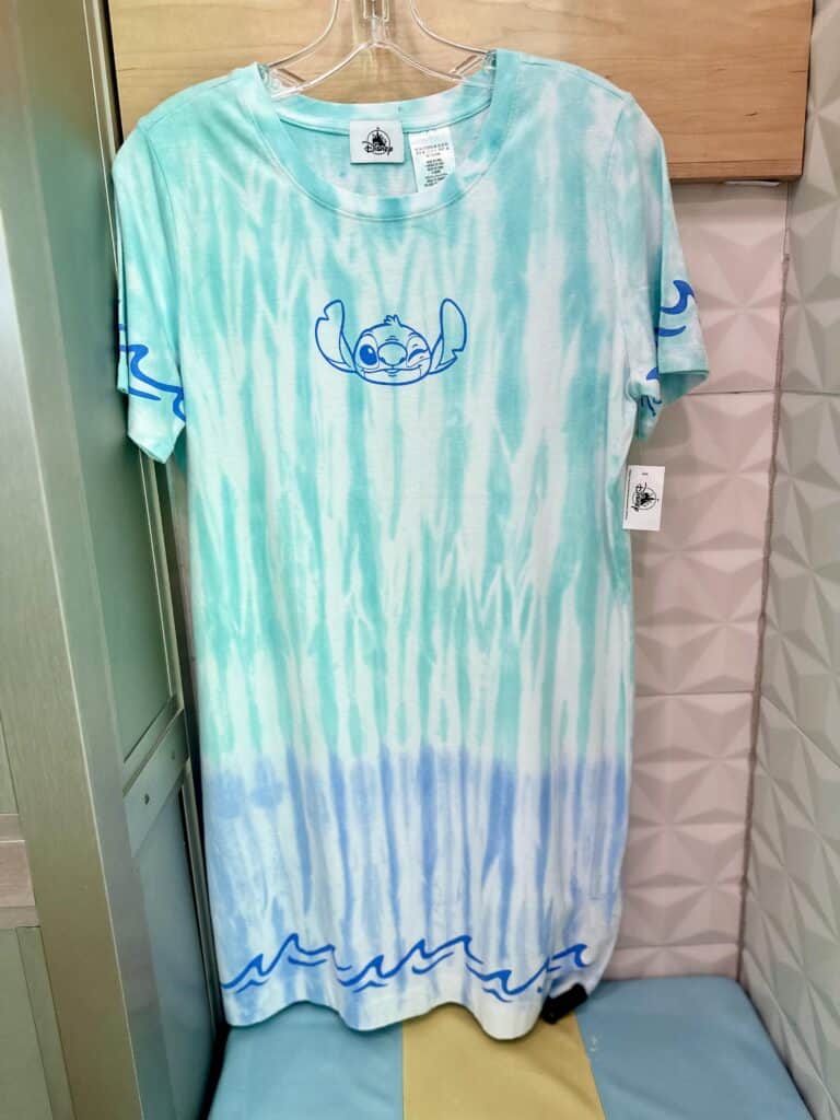 Aunque el día de Stitch ya pasó tenemos un vestido más que presentarte. En tonos azules y verde agua con estilo Tie Dye vemos a Stitch y unos detalles como de olas simplificadas en este vestido estilo camiseta que está cómodo, práctico y perfecto para las actividades de verano. Disponible en Disney Springs.
