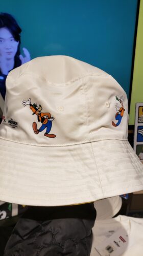 The second hat is a white and yellow combination. One side of the hat is a bright yellow with faces of Mickey and his friends. The other side is white and features Goofy in different poses.