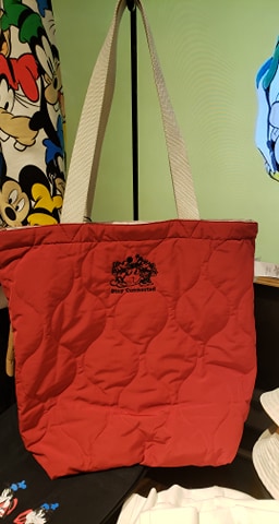 Next, the second bag features retro square images of Mickey and Minnie on one side, while the other side is a red quilted pattern with the “Stay Connected” logo.