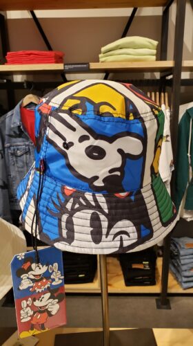 The first hat is a black and printed look. On one side we have a solid black hat. On the other side is an all-over colorful print of retro Mickey Mouse & Minnie Mouse graphics.