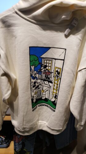 The Staying Connected collection has so many different sweatshirt and t-shirt options to choose from! I really love that Goofy is getting some love here as well. He is featured solo in many of the styles. In addition, you can see that the “staying connected” idea is shown through some of the designs as well. There are t-shirt designs with Mickey and Minnie holding on to telephones.