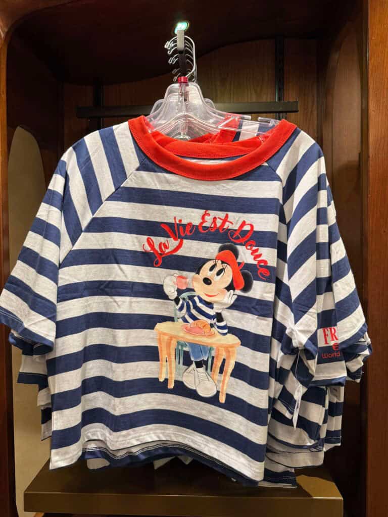 Can we talk about how Tre chic these designs are? I mean the scoop neck blue shirt with the poofy sleeves. Chef’s kiss! Pair it with the white skirt containing renditions of the many stages of Minnie’s French day. The collection teaches us another Parisian outlook, La Vie Est Douce, that life is sweet. And so are these designs!