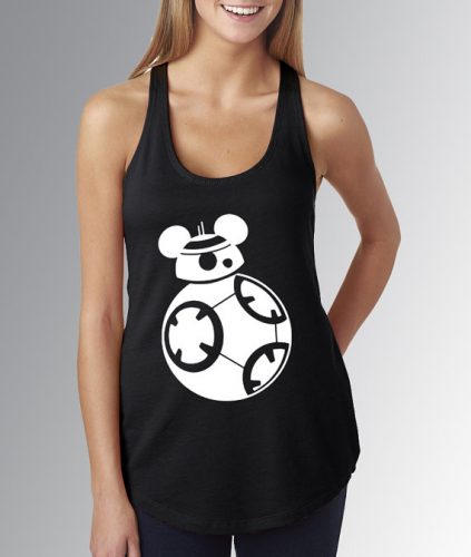 Okay, first let’s talk about this super cute BB8 inspired tank top. First, I love the simplicity of the design (that goes for both shirts actually). This tank top keeps things classic with a black and white color palette. But of course, you have to have a little fun, so BB8 is ready for Disney with some Mickey Mouse ears. This shirt is available for less than $25.00 from CaribouClassics on Etsy.