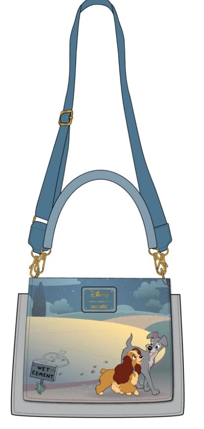 Who doesn’t love the iconic wet cement scene where Lady and the Tramp leave their paw prints? The Lady and the Tramp Wet Cement Crossbody features the infamous JM + EB initials framed by a gold heart (Bonus Disney trivia points if you know what the initials stand for!) with Lady and the Tramp on either side. The back of the bag depicts both dogs walking away from the heart initials with a sign saying, “Wet Cement.”
