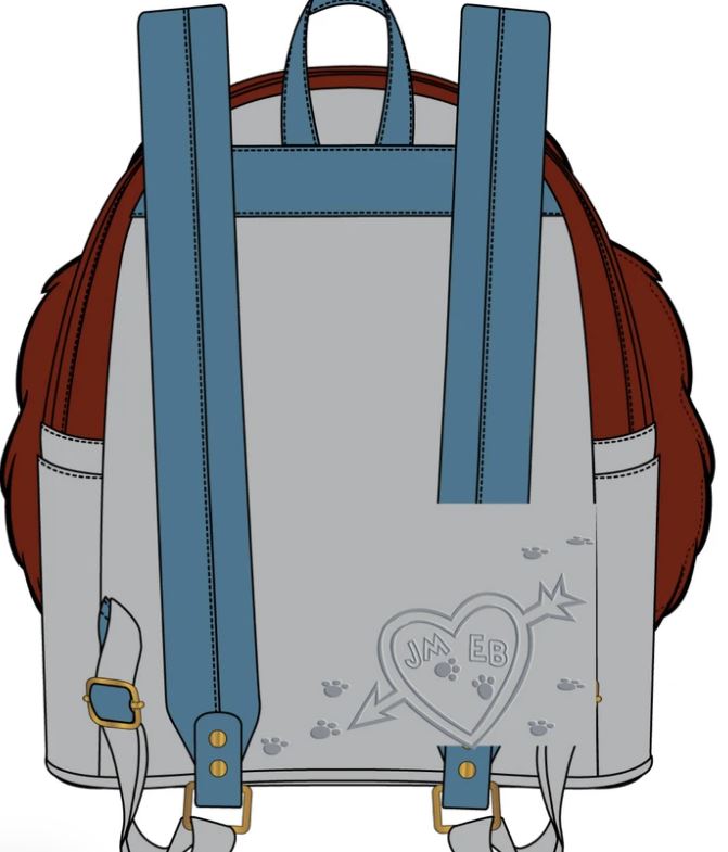 The mini backpack in this collection is paw-sitively adorable! It features Lady and the Tramp on the front – and from the picture, it looks like Lady’s ears might be moveable. You have to love Loungefly’s attention to cute details! The back of the backpack has paw prints and a heart with the initials JM + EB – a sweet nod to the film. In addition, the lining features the same design in an all-over pattern.