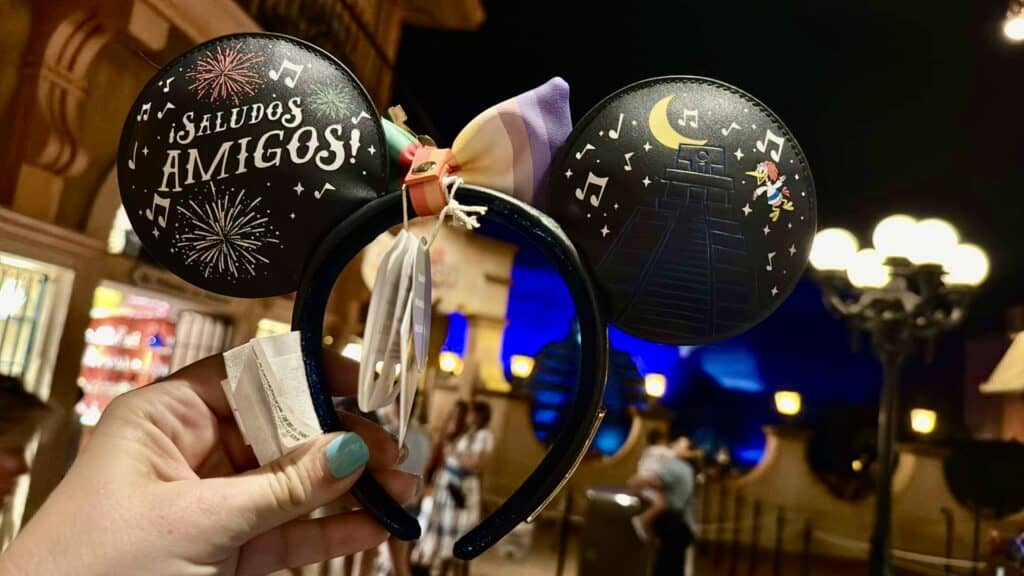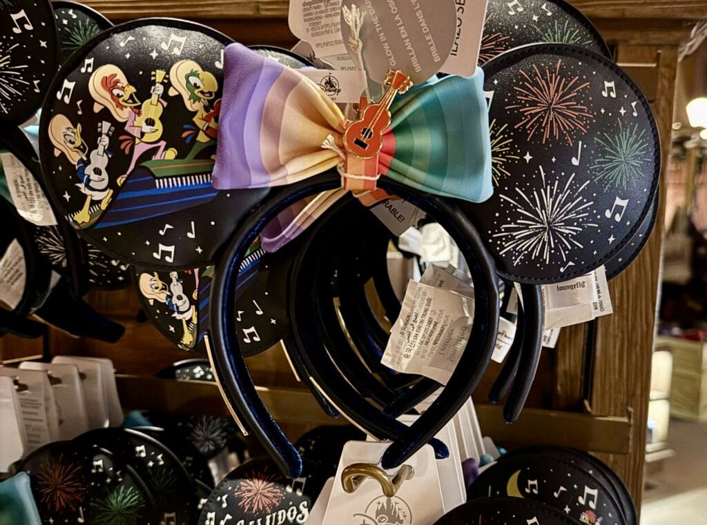 One of the biggest debates for Epcot is, “Do you start in Mexico? Or do you start in Canada?” For all you Team Mexico folks, this merch is for you! Loungefly joins The Three Caballeros in making sweet musical fashion with fun, festive ears. Donald, Panchito Pistolas, and Jose Carioca harmonize together vocally and instrumentally on the design. You’ll also find fireworks, a Mayan pyramid (a nod to the ride at Epcot), and “Saludos Amigos” decorating the ears. A vibrantly colored striped bow is secured in the middle with a miniature guitar! The official country colors spell out “Mexico: Epcot World Showcase” upon the headband.