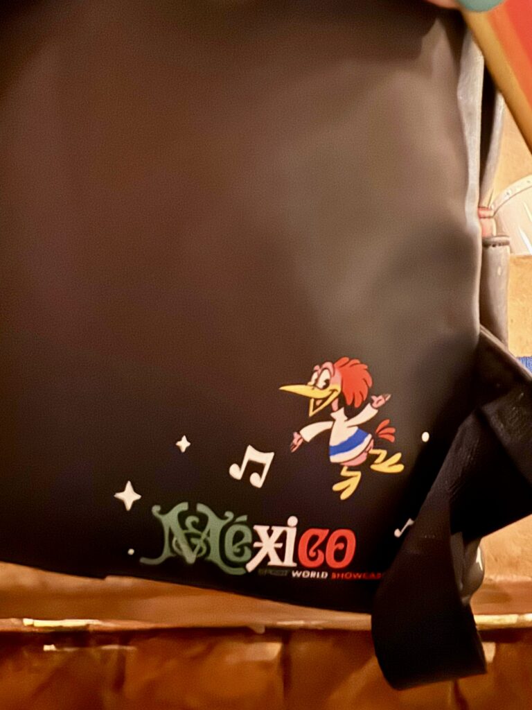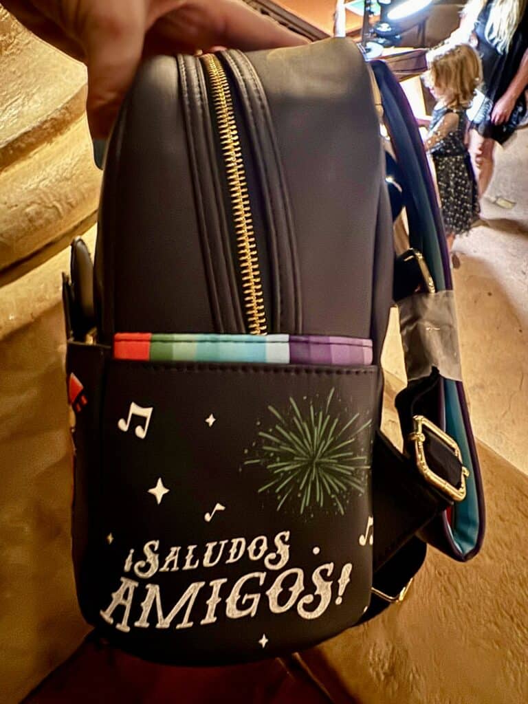 The fiesta continues with the mini backpack. Again, we see an applique of The Three Caballeros in front of the pyramid and fireworks against a black background. It appears to also double as a pocket. More of the designs from the ears are located around the bag, with the addition of a fourth amigo, the eccentric Aracuan Bird. Can’t you just hear his crazy song?