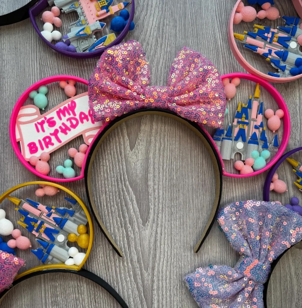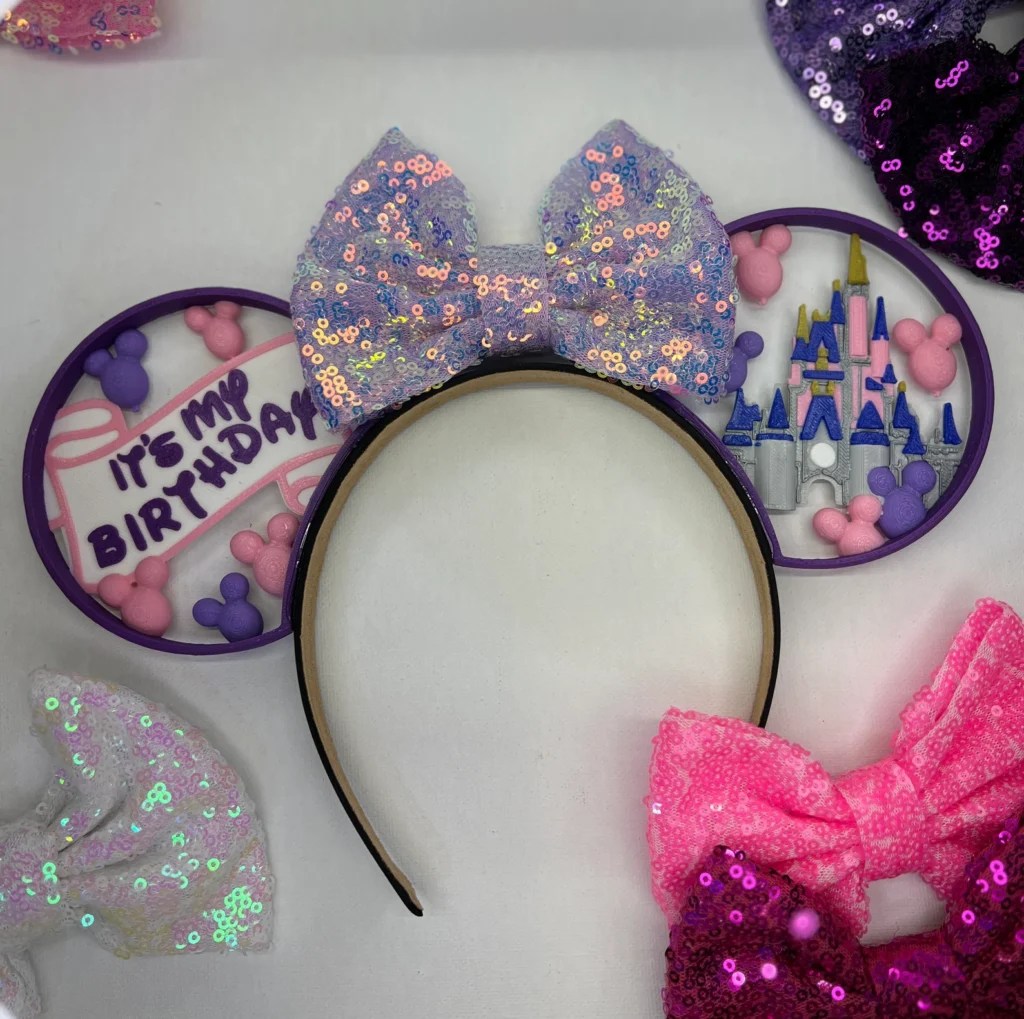 The design instantly reads birthday at Disney. One ear features a cheerful “It’s My Birthday” sign, while the other showcases a detailed castle design. Tiny Mickey-shaped accents add dimension and texture, giving the ears a layered look. A sparkly sequined bow sits front and center, pulling the whole design together with just the right amount of shimmer.