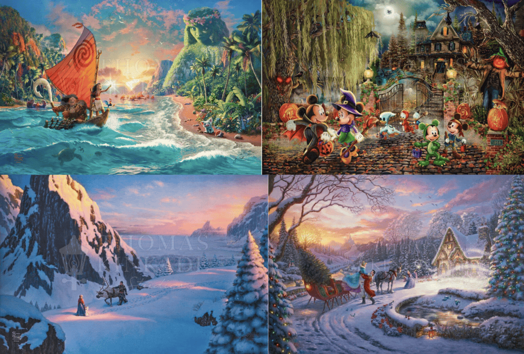 There is also a fabulous Frozen piece that features Anna, Olaf, Kristoff, and Sven on an adventure through the mountains to find Elsa! Although there are fewer Characters in this painting, the stunning landscape speaks for itself! If you would like to purchase this gorgeous Frozen Thomas Kinkade piece, you can find it HERE!