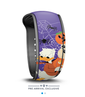 Finally, if you are looking ahead to the fall then the third new band is for you. Goofy and Donald can be seen on either side of this Halloween-themed band. Goofy looks like a scarecrow who is afraid of the crows and spiders that creep around him on his side of the band. Donald, on the other hand, doesn’t seem bothered at all by the spiders. He looks like a duck on a mission to decorate for Halloween! Just look at all of the pumpkins that he is juggling.