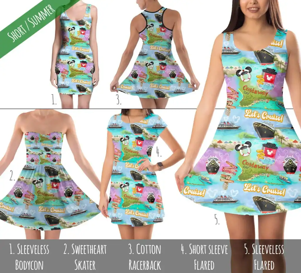 For all fans of Castaway Cay, this is the dress for you! Not only does this dress feature an illustration of the island, but it also has Mickey-shaped clouds, “Let’s Cruise!” phrases, and illustrations of the AquaDuck. Get ready to head to your own private island of style when you wear this fun design!