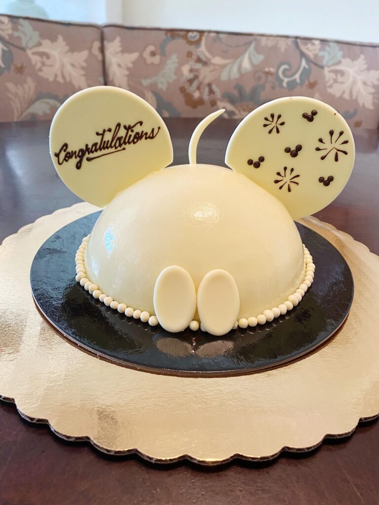 Step one was ordering this delicious Mickey Mouse Celebration Cake from Gasparilla Island Grill! I am such a fan of these cakes – I even got one for my son’s birthday and brought it home (#perksofbeinglocal). They are available at most resort quick services for $39 and feed 4-6 people. You can choose from chocolate or white chocolate, and I can attest that both are equally delicious! The fun part is that there are engraving options, so you can have them say “Happy Birthday,” “Happy Anniversary,” or “Congratulations!” They are such a fun way to honor a loved one and make your stay even more celebratory. Plus, mobile ordering makes purchasing one so easy!