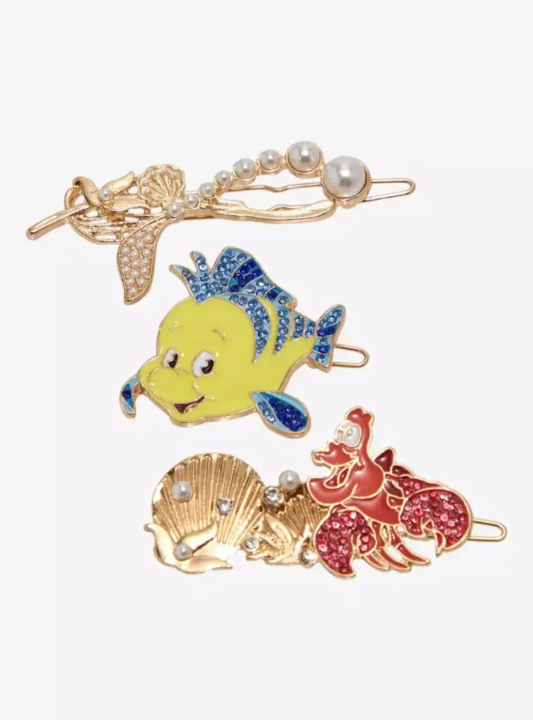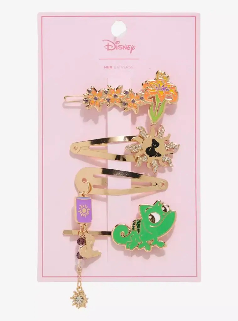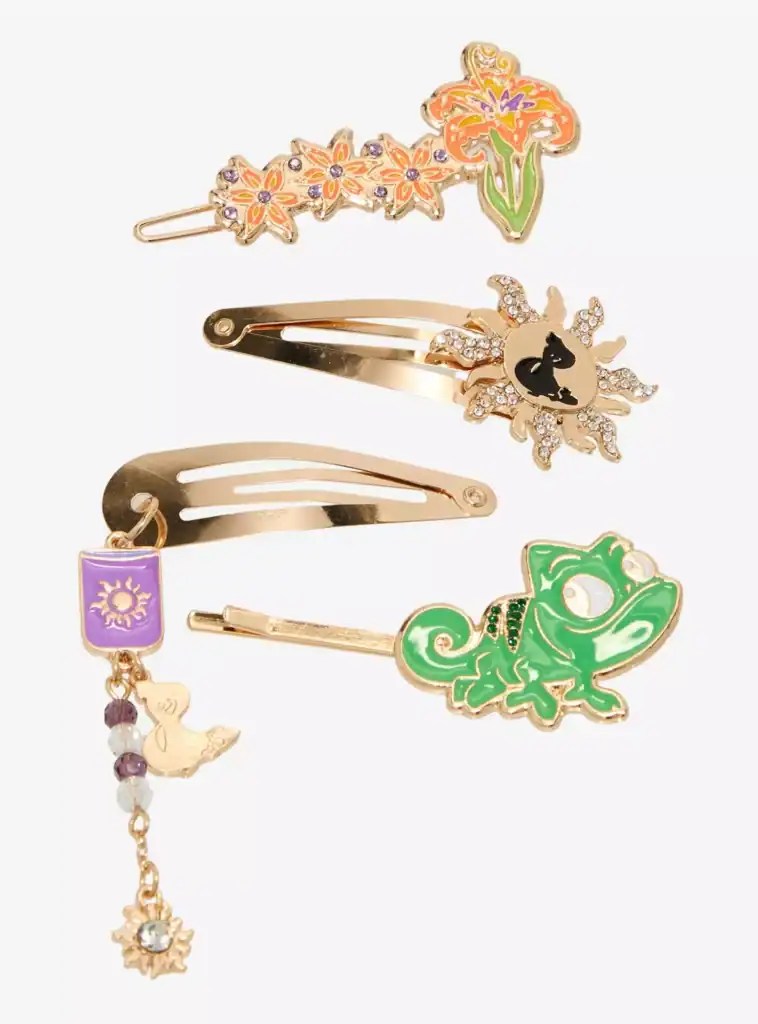 Our strong-willed mermaid makes a splash with a beautiful barrette featuring a shimmering mermaid tail and delicate pearls. What a beautiful ode to Ariel! She’s joined by her trusted friends: the ever-loyal Flounder and Sebastian, her father’s faithful courtier. Celebrate strong women everywhere with the Lost Princess, Rapunzel. Additionally, the first option lets you wear flowers in your hair just as she does. Two snap barrettes honor her story, one adorned with the sun crest of Corona and a nod to the Snuggly Duckling, and the other dripping in charms, including a glowing lantern. To complete the look, her loyal chameleon Pascal adds a playful finishing touch.