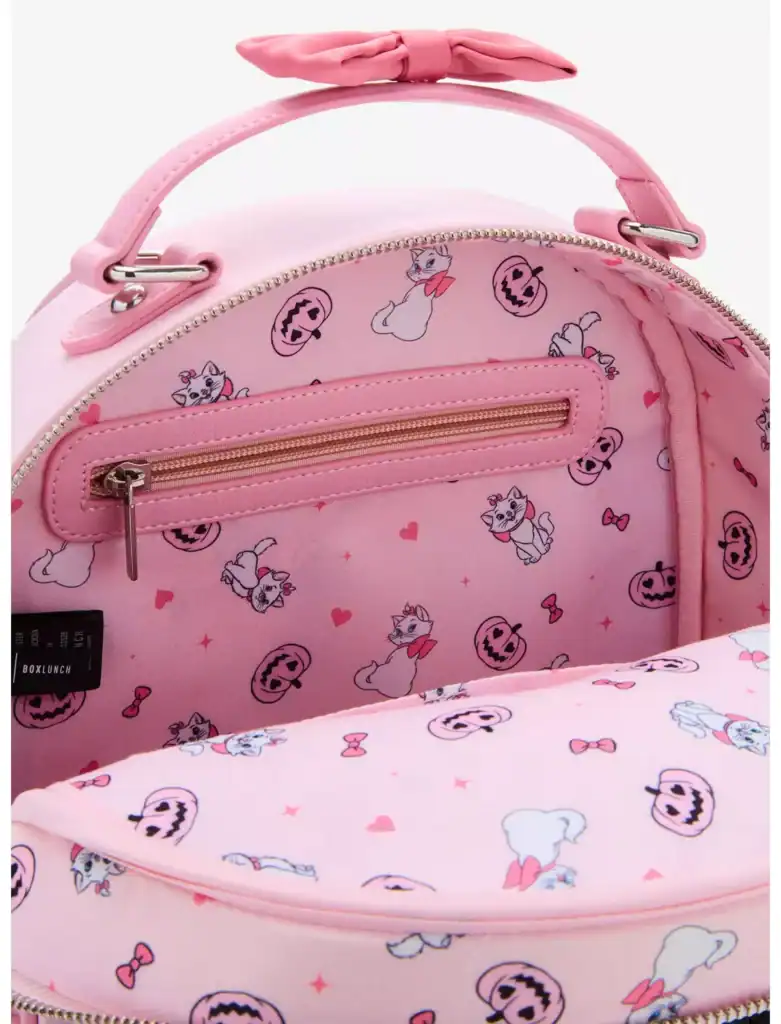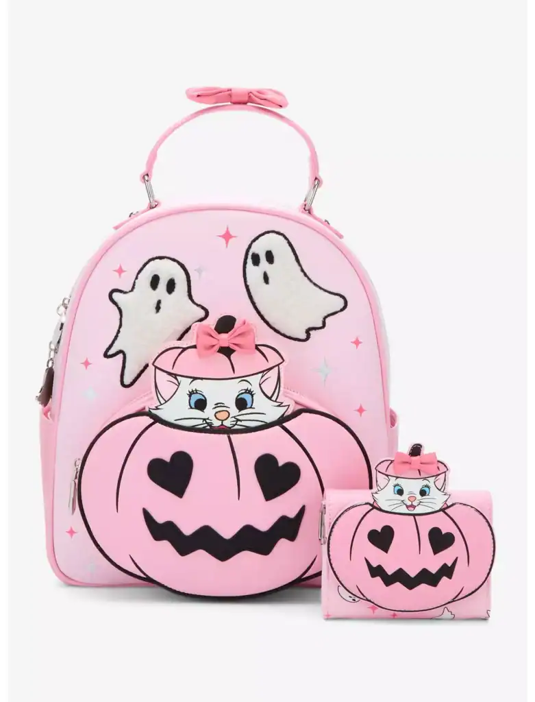 The mini backpack features a delightful Marie peeking out from a jack-o’-lantern—but not just any pumpkin. This one is pink, heart-eyed, and downright adorable! Two little ghost buddies float above her with an expression that says they’re more about fun than fright.