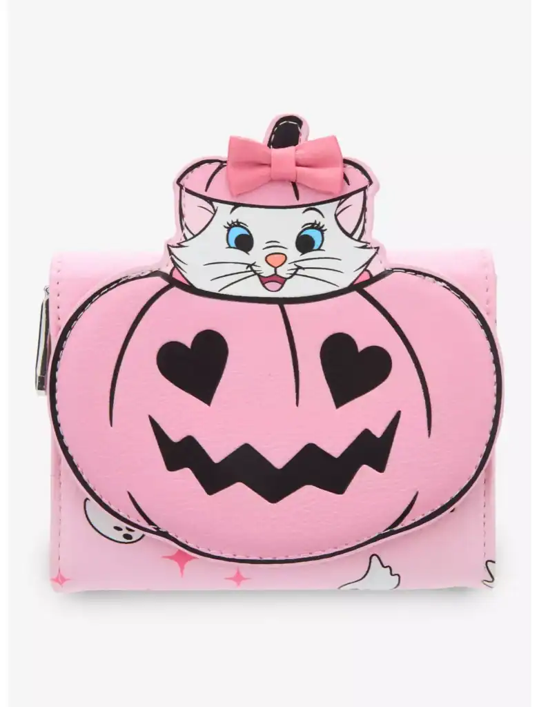 The matching wallet carries the same candy-colored charm, with Marie popping out of another pink pumpkin and that signature bow front and center. It’s the kind of piece that makes even a quick coffee run feel like a Halloween celebration.
