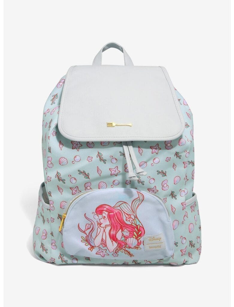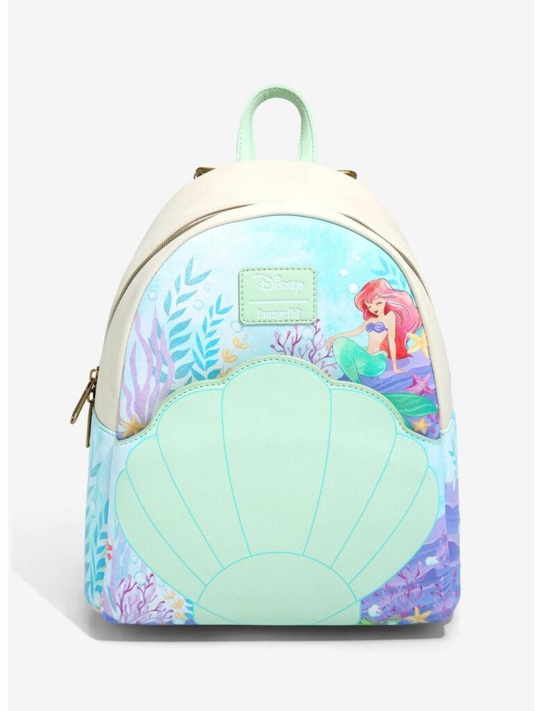 I’m kicking off the post with a look at one of my favorite new Little Mermaid inspired designs! The Loungefly Disney The Little Mermaid Shell Mini Backpack is perfect for any seaside summer adventure. I absolutely love the watercolor style and cool color palette. Plus, Ariel just looks gorgeous as she sits atop this bag. You can get it HERE.