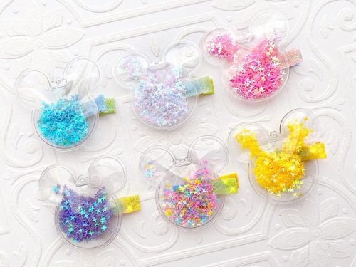 These glittering hair clips are perfect for wearing to the Disney Parks on the days that you don’t want to wear your favorite mouse ears. Each clip is a gorgeous clear puffy Mickey balloon that measures about three inches. The confetti color of your choice sits on a matching partially lined glitter alligator clip or skinny elastic headband.
