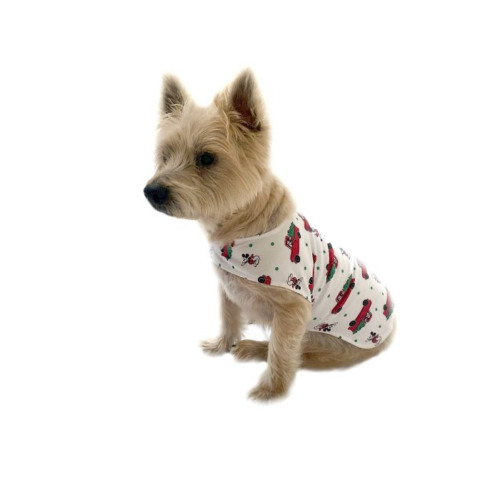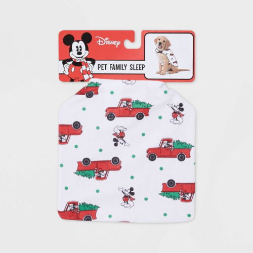 The precious pattern on these pajamas features a white background with green polka dots.  Dispersed among the green polka dots you can spot Mickey wearing a scarf with his hand up in the air.  I’d like to think he is trying to catch snowflakes!  You can also spot Mickey waving from the driver’s seat of a red truck carrying a Christmas tree!  The red, green, and white allover pattern on these pajamas is so perfectly Christmas, and Mickey adds a touch of extra pixie dust!