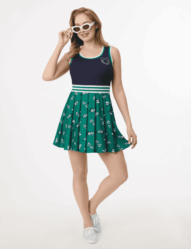 This charming navy and green tennis dress features an adorable print of Mickey and Goofy that’s sure to bring a smile to your face. With its flirty pleated skirt, you’ll feel playful yet chic as you ace every match or enjoy a day out with friends.