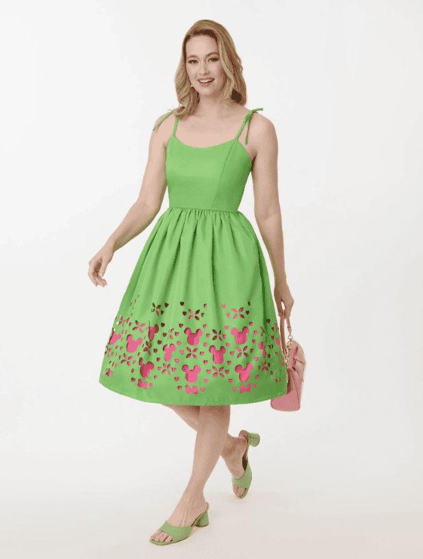This charming swing dress is crafted in a neon green woven fabric and features a Mickey cutout design against a neon pink backdrop. The look is outfitted with a princess seamed bodice and secured by dual self-tie spaghetti straps.