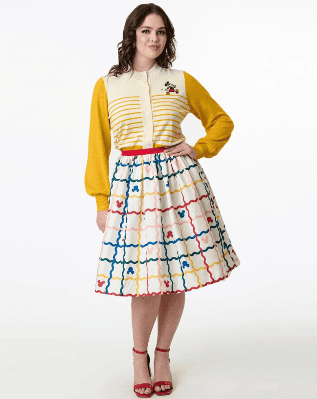 This 1950s style swing skirt is crafted in a white woven fabric that boasts a rainbow plaid and Mickey heads throughout.