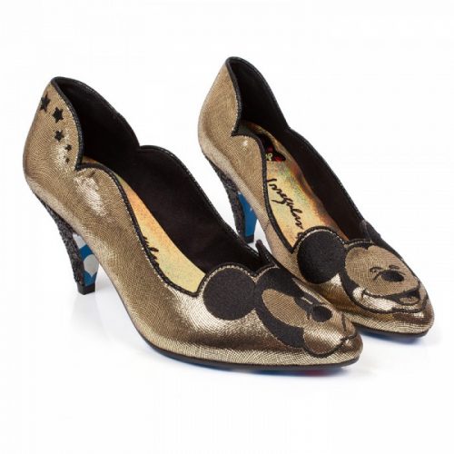 “Oh boy” these golden Mickey Mouse mid heels with a glittering heel are sure to put a smile on your face, featuring a textured gold fabric upper, embroidered Mickey face detail and a cascade of embroidered stars on the heel.