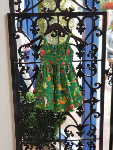 The Enchanted Tiki room has gotten a mini version, so Mommy and her Me can show off this beautiful emerald dress with vibrantly colored tropical birds. They’re practically identical in design too.