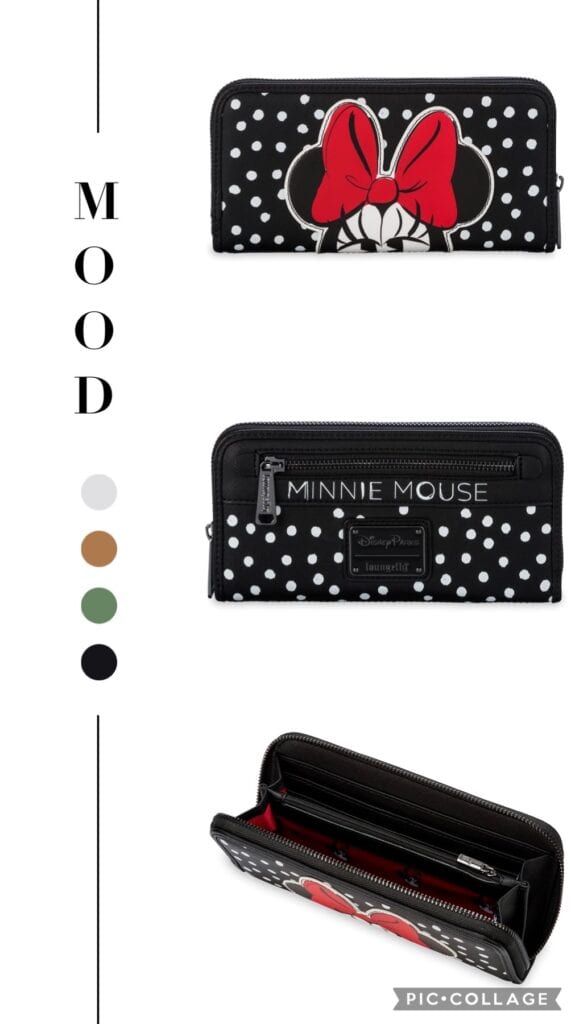 The coordinating Loungefly Minnie Mouse wallet is definitely a MOOD. I’ll name that mood Sassy! Again, the wallet is characterized by Minnie’s ears, bows and lashes. White dots rock the background pattern and are reminiscent of Movie lights. Lights that feature our Queen Minnie!