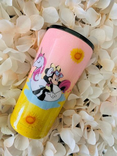 This Minnie Mouse inspired tumbler is all about summer fun! The design features the always fashionable Minnie Mouse sitting on an absolutely fabulous unicorn pool float. I totally want a matching pool float for the summer as well! The tumbler is made with light pink glitter on top and yellow glitter on the bottom for the perfect sunset ombre effect!