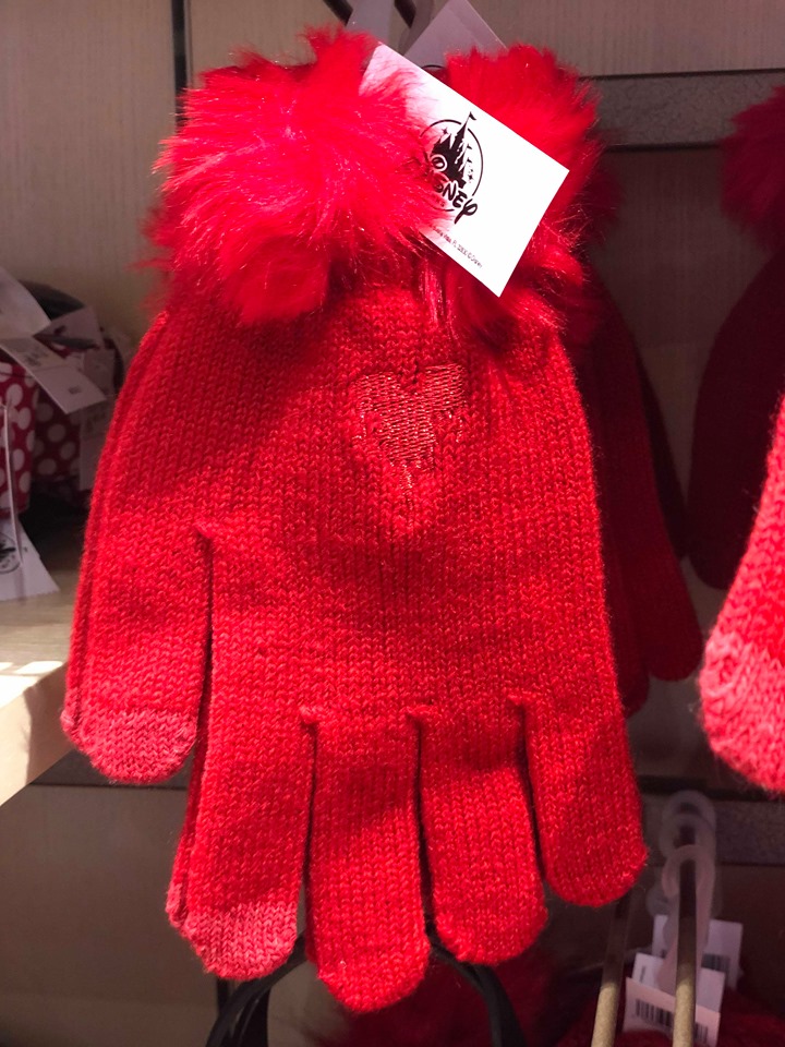 The coordinating gloves are really just the icing on the cake. They have the same fluffy pom poms, but these almost make a bow shape. A cute little heart is embroidered at the top with shimmery thread, which gives us more coordination! The matching gloves are available for $19.99.