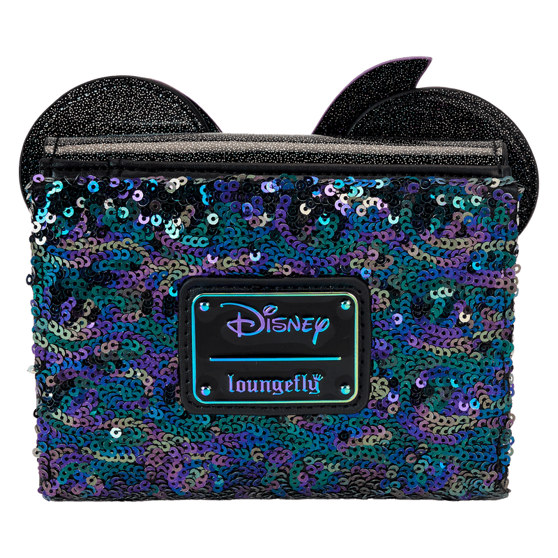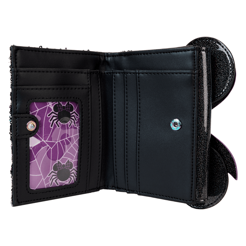 A coordinating flap wallet glistens in the light thanks to its shiny, oil-slick sequin design. I wonder if it will help me hold onto my money. Not when it comes to this set! Check out the slick glitter web bow lined with purple. The clear ID window features a Minnie cutout.