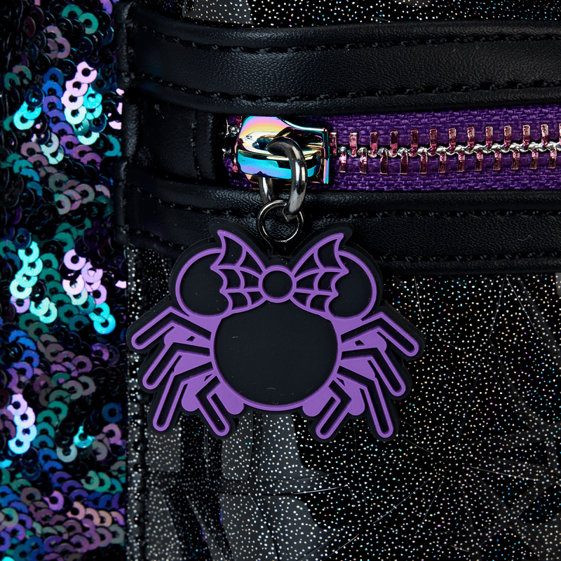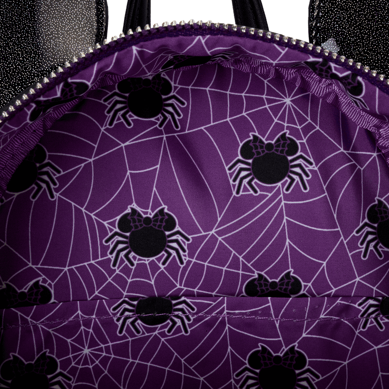 The Minnie Backpack features our favorite Fashionista as a spider. But what a glamourous one she is! From the black glitter ears perched atop the bag, to the jewel toned sequins covering it, channel a pretty side of the little arachnid mouse! Purple plays a big role in the theming which brings out more femininity. Check out the Minnie zipper pull and interior lining, both featuring the passionate color.