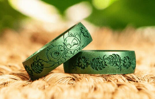 Last, but certainly not least, is the Stitch & Angel Ring, which is an iridescent green ring featuring Stitch and Angel looking adorable together with his hand on her cheek and her hands around his arm along with hibiscus flowers, plumeria flowers, and palm fronds!