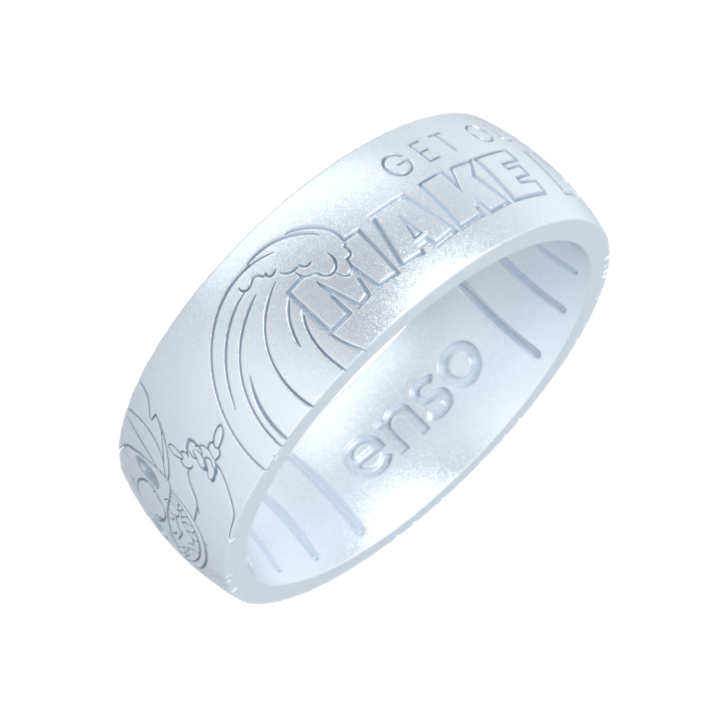 First up is the Make Waves Ring, which is an iridescent diamond white ring featuring the words “Get out and make waves” along with waves, Stitch on a surfboard, and Stitch making the Shaka sign, also known as the Hang Loose hand sign!