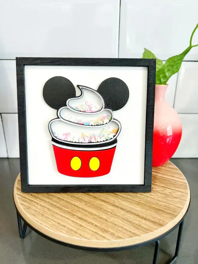 This sweet Disney inspired Mouse Cupcake shaker is perfect for any party! The wood sign is the perfect size for your tiered tray décor or as stand-alone decoration. I think that this would be so cute on a cupcake or sweets themed tiered tray!