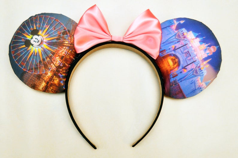 There is nothing more classic about Disney than Disneyland! I’m calling these the “West Coast Love” Ears because they honor Disneyland and Disney California Adventure. On one side, you can see Sleeping Beauty Castle at twilight, lit up in beautiful glory. On the other side, Mickey’s Fun Wheel is illuminating Disney California Adventure on a fun-filled night. The center features a darling pink bow. You can get them HERE.
