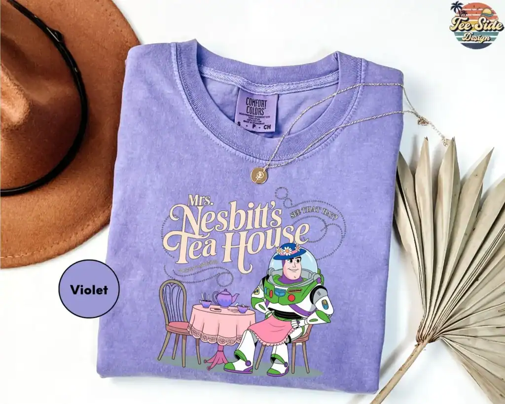 Toy Story fans, get ready to sip tea in style! The Mrs. Nesbitt’s Tea House Shirt from TeeSideDesign on Etsy brings Buzz’s funniest moment to life.