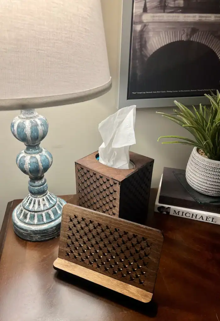In addition to this display, you can complete the look with the matching tissue box holder (found HERE) and a matching catchall tray (found HERE).