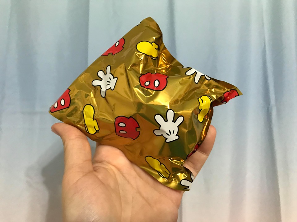 Once you peel off the wrapper and twist open the egg you’ll find the fun gold foil pouch! The foil pouch isn’t just a plain ‘ol gold though, there are Mickey pieces all over it!