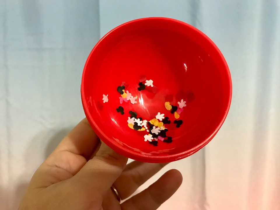 Which is fitting, because inside each gold foil package along with the mystery character, is a handful of Mickey confetti pieces! Tiny paper confetti pieces featuring Mickey gloves, shoes, ears, and pants shake out with your figure, for extra fun!