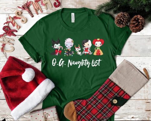 If you made the Naughty list then this O.G. Naughty List Disney Villain t-shirt is perfect for you! It features Maleficent, Ursula, Cruella De Vil, and the Queen of Hearts. The villains each have a little touch of holiday spirit in the outfits they are wearing. Maleficent is holding a candy cane, Ursula has Christmas bulbs instead of bubbles, Cruella is wearing a Santa dress under her dalmatian coat, and the Queen of Hearts appears to be wearing an ugly Christmas sweater. For an added touch, one of Cruella’s dalmatians is even on the shirt dressed up as a reindeer. You can find this tee HERE.