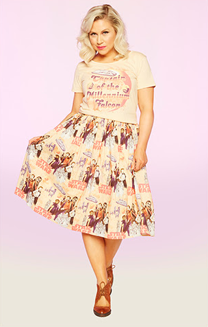 The first is a shirt and circle skirt combo. This outfit is inspired by the new Star Wars: Solo film heading to theaters in May. The shirt is a soft sunset color that says “Captain of the Millennium Falcon” in a very retro ombre lettering style. The skirt has a repeating pattern print of a theatrical poster design.